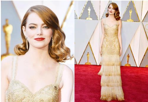 除了讓人窒息的豪放氣息之外,金色也具有登峰造極的復(fù)古奢華和貴族韻味。就像Emma Stone征戰(zhàn)奧斯卡時(shí)所穿的Givenchy高定金色禮服,一襲鎏金配上精致的剪裁和刺繡流蘇,舉手投足間的魅力不成方物,風(fēng)華絕代。