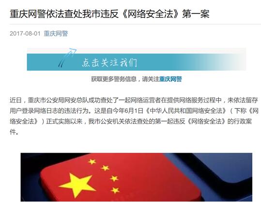這兩天被各大新聞網(wǎng)站一條來自重慶公安局網(wǎng)安總隊(duì)的新聞吸引,因?yàn)樗鸵酝覀冇∠笾械木W(wǎng)警新聞差別,包羅了一個(gè)很有意思的關(guān)鍵詞:《網(wǎng)絡(luò)安適法》。輾轉(zhuǎn)來到源頭重慶網(wǎng)警公眾號(hào)我們找到詳細(xì)的內(nèi)容:重慶市某科技發(fā)展有限公司自 2017 年 6 月 1 日后,在提供互聯(lián)網(wǎng)數(shù)據(jù)中心辦事時(shí),存在未依法留存用戶登錄相關(guān)網(wǎng)絡(luò)日志的違法行為,按照《網(wǎng)絡(luò)安適法》第二十一條(三)項(xiàng)、第五十九條之規(guī)定,決定給予該公司警告處罰,并責(zé)令限期十五日內(nèi)進(jìn)行整改。