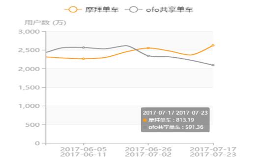 數(shù)據(jù)顯示,在周日均活躍用戶量( 7 月 17 日至 23 日),摩拜 813 萬,ofo591 萬,摩拜領(lǐng)先38%。其中在 6 月 5 日至 11 日~ 7 月 17 日至 23 日周日均活躍用戶量雙月走勢上,摩拜從 659 萬增長至 813 萬,,增幅為23%,ofo從 839 萬下滑至 591 萬,降幅為30%。