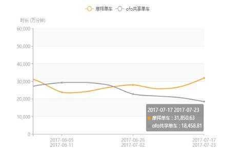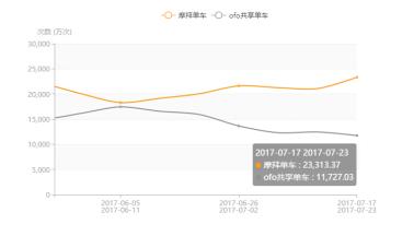在APP周使用次數(shù)( 7 月 17 日至 23 日)摩拜 23313 萬次,ofo11727 萬次。在 6 月 5 日至 11 日~ 7 月 17 日至 23 日期間的APP周使用次數(shù)雙月走勢方面,摩拜從 18269 萬次增長至 23313 萬次,增幅為28%;ofo從 17443 萬次下滑至 11727 萬次,降幅為33%。