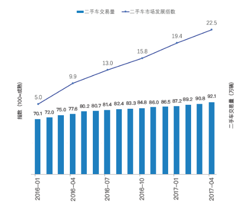 據(jù)了解,二手車發(fā)展指數(shù)由車輛供給量、消費者需求量、成交情況、金融產(chǎn)品供給、金融產(chǎn)品成交等多種關(guān)聯(lián)因素構(gòu)成,是衡量二手車市場發(fā)展程度的重要指數(shù)。在過去一年多時間里,該指數(shù)從5. 0 飆升至22.5,同比激增逾三倍,顯示出強勁的發(fā)展動能。