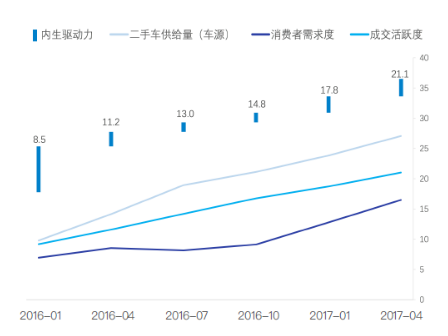 從市場內(nèi)生驅(qū)動力來看,二手車車源供給量上升是驅(qū)動市場發(fā)展指數(shù)的重要因素。數(shù)據(jù)顯示, 2017 年 4 月,二手車車源供給指數(shù)已達到27.1,同比上升12.9%。不雅觀察具體車輛來源不難發(fā)現(xiàn),二手車車源的增加除了來自大量 3 到 6 年退役的車輛外,還因為互聯(lián)網(wǎng)將更多隱性車源信息聯(lián)動顯示了出來。同時,汽車租賃產(chǎn)品、準新車的加入也促進了二手車車源供給的多元化,既豐富了傳統(tǒng)二手車車源供給,也有效提升了整體二手車市場的品質(zhì),成功破解了二手車市場長期存在的車源信息分散,優(yōu)質(zhì)車源缺乏等困擾行業(yè)發(fā)展的難題。