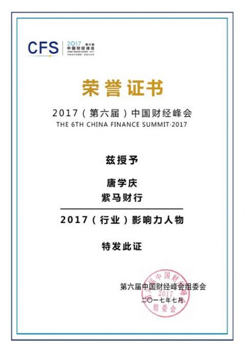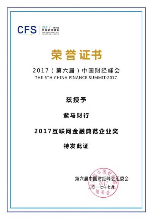 7 月 19 日、 20 日,第六屆中國財(cái)經(jīng)峰會在京舉辦。峰會組委會授予紫馬財(cái)行“ 2017 互聯(lián)網(wǎng)金融典范企業(yè)獎”,同時,紫馬財(cái)行CEO唐學(xué)慶也榮膺“2017(行業(yè))影響力人物”。