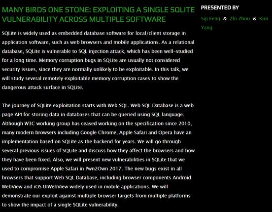 據(jù)悉,本年長(zhǎng)亭科技的議題選用一個(gè)具有中國(guó)文化含義的表達(dá)——many birds one stone,“一石多鳥(niǎo):利用單個(gè)SQLite漏洞破解多個(gè)軟件”,是一個(gè)與SQL內(nèi)存破壞漏洞相關(guān)的話(huà)題。