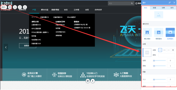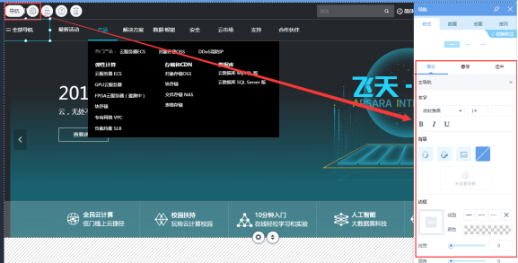 云·速成美站中的“導(dǎo)航控件”包孕橫向?qū)Ш脚c豎向?qū)Ш?,并且有不少樣式可以直接選用。這次挑戰(zhàn)中,參考阿里云官網(wǎng)首頁,我使用的是豎向?qū)Ш健?/p>