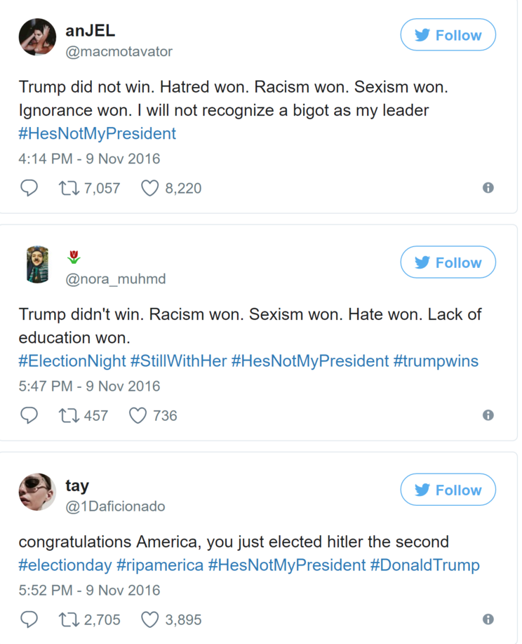 推特上有諸如 #NotMyPresident 和 #HateWon 等話題標(biāo)簽,使用這些標(biāo)簽的人們無疑向外界暗示著如下信息:特朗普的支持者充滿了對(duì)世界的偏見,因此他們才會(huì)選舉他做總統(tǒng),而我們這些反對(duì)特朗普的人才是正義的一方,是好人,好人就要對(duì)抗那些選特朗普做總統(tǒng)的壞人。我們與壞人你死我活,不單如此,看到這條消息的你也應(yīng)該對(duì)那些壞人恨之入骨。