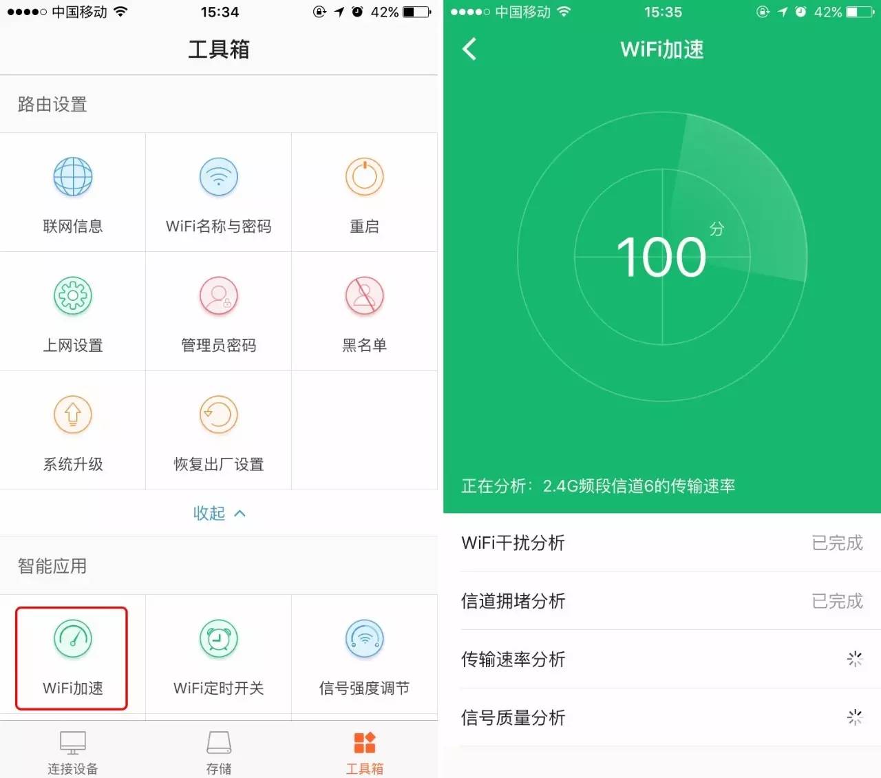 使用方法:打開騰達(dá)智能路由APP,點(diǎn)擊【工具箱】——【W(wǎng)iFi加速】即可。