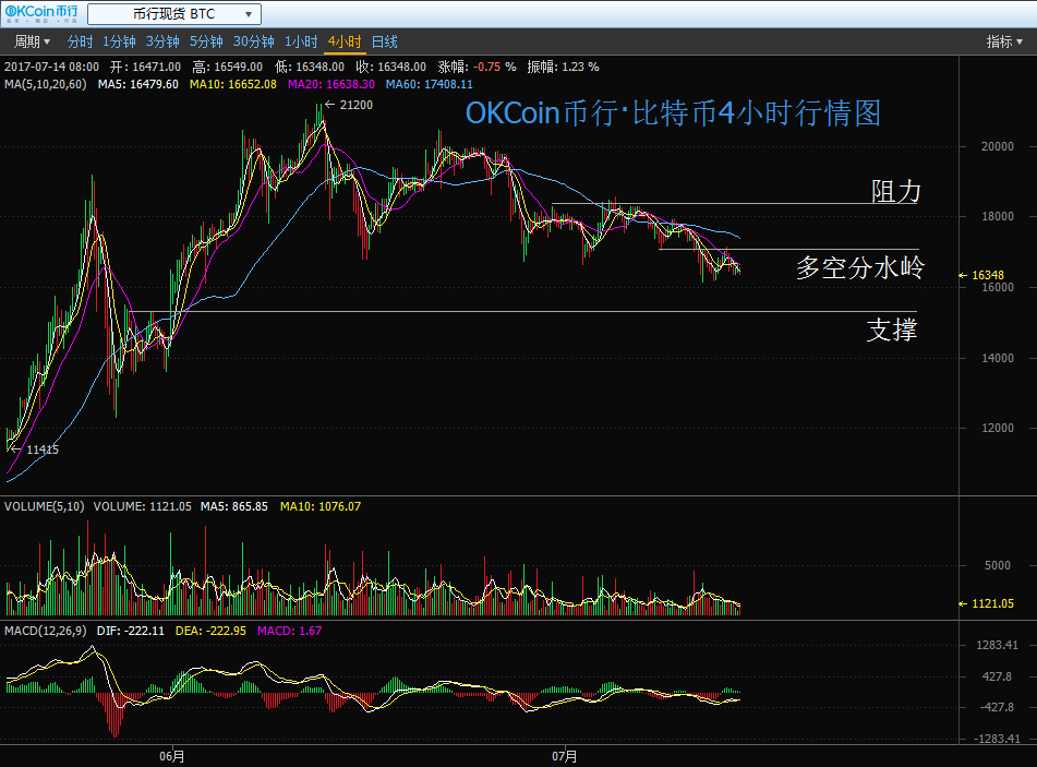 7 月 14 日消息,按照國內(nèi)知名的數(shù)字資產(chǎn)交易平臺(tái)OKCoin幣行的數(shù)據(jù)顯示,比特幣昨天( 7 月 13 日)價(jià)格在開始后延續(xù)此前以交易日的漲勢(shì)繼續(xù)延續(xù)反彈行情,但是好景不長,至亞市早盤 8 點(diǎn)時(shí)段的 17160 高點(diǎn)后便戛然而止再度回落,收盤后以回吐日內(nèi)全部漲幅。截止今日發(fā)稿前,價(jià)格依舊在低位運(yùn)行,最新交投于 16350 附近。