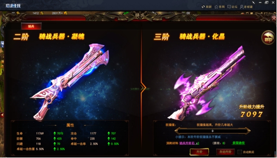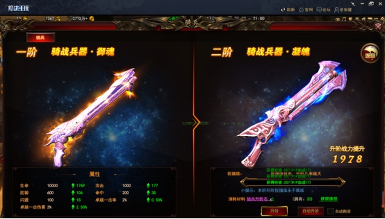 作為傲天魔法王座中的騎戰(zhàn)武器,一階御魂直接提升戰(zhàn)斗力過萬,各種屬性更是瘋狂飆升。想要騎兵威力更甚,那就得努力積累騎兵進(jìn)階石。看看進(jìn)階提示,升級(jí)到 2 階的凝魂可以再讓戰(zhàn)力提升 2000 擺布,各種屬性又將再度增長一些。是不是很想知道到底可以增長多少?看看左側(cè)綠色箭頭后的綠色數(shù)值。