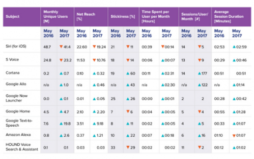 陳訴通過(guò)六種差別的尺度對(duì)語(yǔ)音助手的使用范圍和流行程度進(jìn)行分析,發(fā)現(xiàn)Siri在六個(gè)尺度中,有五個(gè)都呈現(xiàn)下滑的趨勢(shì),其中還包孕凈覆蓋范圍(潛在用戶數(shù)與實(shí)際用戶數(shù))、用戶粘性(每月持續(xù)使用的用戶數(shù))以及總使用時(shí)間和每月使用次數(shù)。