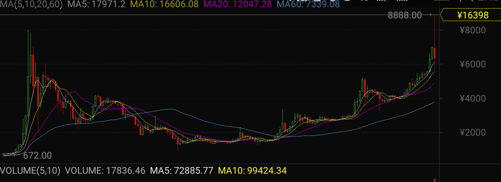 早在2013年,比特幣就曾經(jīng)沖上高點。2013.10.7-2013.11.18一個多月的時間內(nèi),比特幣價格從760元人民幣最高沖至7995元人民幣,漲了整整10倍,然后即是慢慢熊市路,一直到2017年,比特幣價格才再次突破8000元。