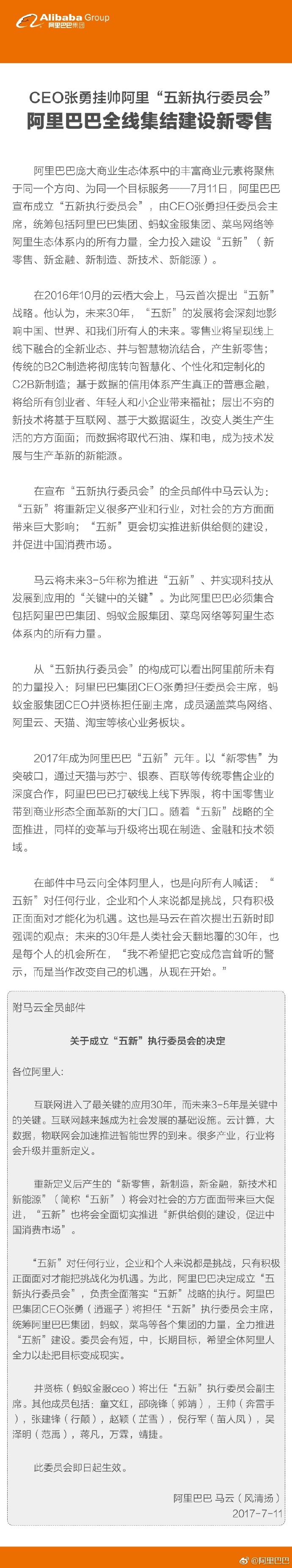 站長之家(Chinaz.com) 7 月 11 日消息 早在 2016 年 10 月的云棲大會上,馬云就提出“五新”戰(zhàn)略。今日早晨,阿里巴巴官方正式對外頒布頒發(fā),成立“五新執(zhí)行委員會”,“五新”包孕新零售、新金融、新制造、新技術、新能源。