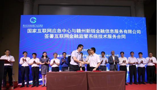 在簽約環(huán)節(jié),首先由贛州市委常委、常務(wù)副市長李恭進(jìn)、國家互聯(lián)網(wǎng)應(yīng)急中心副主任、總工程師云曉春與新華網(wǎng)股份有限公司董事、黨委常委、副總裁申江嬰簽署三方戰(zhàn)略合作協(xié)議;其次由國家互聯(lián)網(wǎng)應(yīng)急中心科技成果轉(zhuǎn)化中心副主任王魯華與贛州新鏈金融信息辦事有限公司總經(jīng)理范金剛簽署互聯(lián)網(wǎng)金融監(jiān)管系統(tǒng)技術(shù)辦事合同;最后,贛州經(jīng)濟(jì)技術(shù)開發(fā)區(qū)管委會黨工委委員、副主任朱建華與北京太一云科技有限公司董事長鄧迪簽署合作協(xié)議。