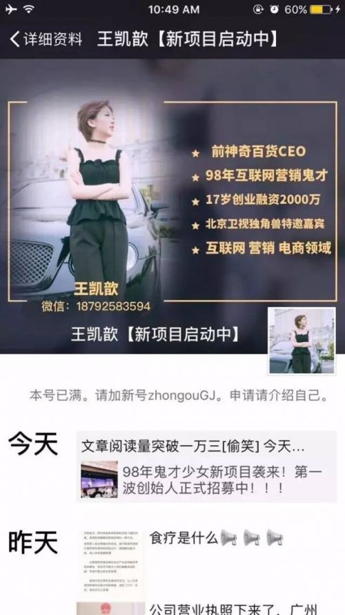 在封號(hào)的前一天,王凱歆還在個(gè)人微信上頒發(fā)文章稱,“98年鬼才少女新項(xiàng)目襲來(lái),第一波創(chuàng)始人正式招募中”,文章內(nèi)容顯示,目前她正在啟動(dòng)“大健康”標(biāo)的目的的項(xiàng)目,并在對(duì)外招募聯(lián)合創(chuàng)始人。