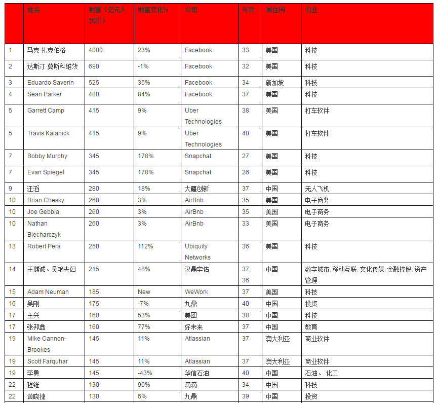 附:2017胡潤全球少壯派空手起家富豪榜前22名榜單