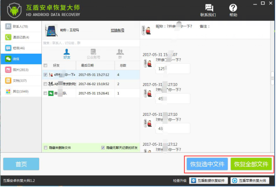 ⑤ 靜待軟件掃描完成,請在軟件左側(cè)列表選擇要備份及恢復(fù)的類型“微信”,切換到微信聊天記錄恢復(fù)界面,在這里選擇要恢復(fù)的微信好友可以在右側(cè)查看相關(guān)的微信聊天記錄內(nèi)容,確認要恢復(fù)的微信聊天記錄,然后勾選要恢復(fù)的微信好友,點擊“恢復(fù)選中文件”即可將微信聊天記錄導(dǎo)出到電腦上;也可以點擊“恢復(fù)全部文件”導(dǎo)出全部微信聊天記錄即可。