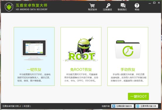 ③ 在互盾安卓恢復(fù)大師界面中,我們可以看見三種數(shù)據(jù)恢復(fù)模式,這里請點擊“一鍵恢復(fù)”功能,切換界面后根據(jù)軟件提示使用強力一鍵ROOT軟件獲取安卓手機root權(quán)限。