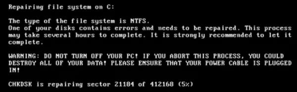 阿里云在對(duì)病毒樣本進(jìn)行研究后發(fā)現(xiàn),操作系統(tǒng)被感染后,重新啟動(dòng)時(shí)會(huì)造成無(wú)法進(jìn)入系統(tǒng)。下圖顯示的就是病毒偽裝的磁盤(pán)掃描程序。
