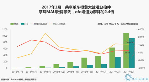 Data發(fā)布的《 2017 年Q1 中國共享單車行業(yè)用戶監(jiān)測陳訴》中的數(shù)據(jù)也證明了ofo小黃車的發(fā)展速度驚人。TrustData陳訴顯示,在 2017 年 1 季度,ofo的月活躍用戶數(shù)呈現(xiàn)出了快速增長的趨勢,在 3 月ofo的環(huán)比增速達(dá)到了近170%,為行業(yè)最高水平,同為行業(yè)第一梯隊的摩拜僅為71.6%,而整個共享單車行業(yè)的平均增速為105%??紤]到ofo在整個行業(yè)內(nèi)的體量和權(quán)重,可以說在整個 1 季度的共享單車增長中,始終連結(jié)高增速的ofo是當(dāng)之無愧的發(fā)動機(jī)。