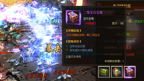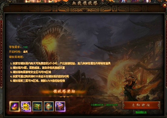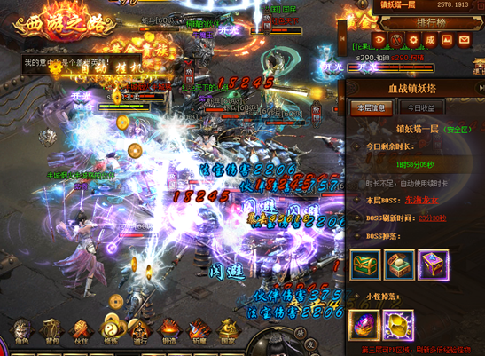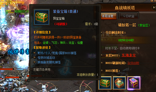 以上是第一層的情況,每層都會(huì)有一個(gè)BOSS,能看到小怪以及BOSS掉落的獎(jiǎng)勵(lì),非常的豐厚。鎮(zhèn)妖塔第三層的PK區(qū),專門刷新2~ 5 倍經(jīng)驗(yàn)怪物,想要經(jīng)驗(yàn)值爆棚又有絕對(duì)實(shí)力的傲天西游之路小伙伴不妨事進(jìn)入第三層PK去賺取大把經(jīng)驗(yàn)值,繼續(xù)往上努力吧。