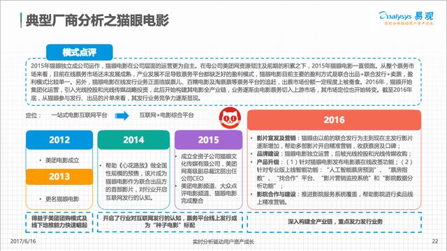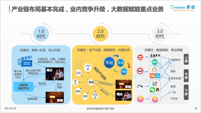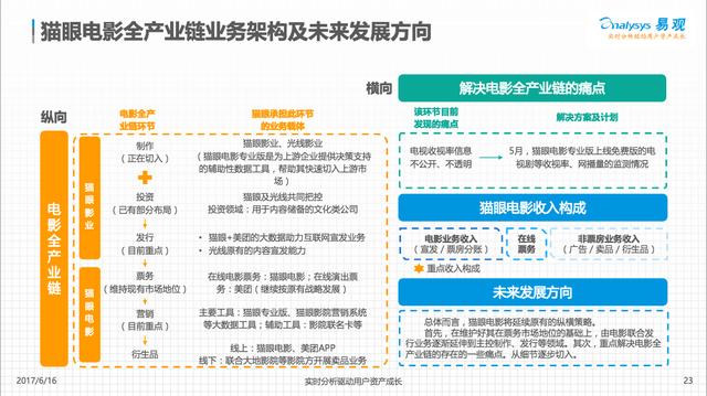 貓眼電影作為在線票務(wù)典型廠商,經(jīng)過 4 年深耕細(xì)作和快速發(fā)展,已經(jīng)基本完成了從一站式電影票務(wù)平臺向“互聯(lián)網(wǎng)+電影綜合平臺”的轉(zhuǎn)型,實(shí)現(xiàn)了從在線票務(wù),到上游電影制投宣發(fā)業(yè)務(wù),以及中下游影院大數(shù)據(jù)支持辦事的全產(chǎn)業(yè)鏈布局,領(lǐng)先優(yōu)勢十分明顯。