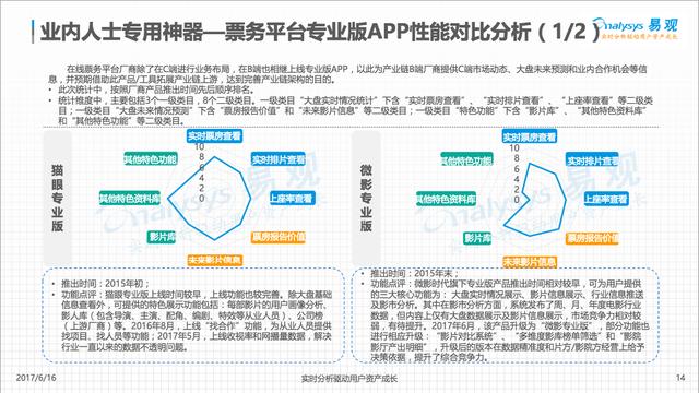 在易不雅觀的分析中,別離從“實(shí)時(shí)票房查看”、“實(shí)時(shí)排片查看”、“上座率查看”、“票房陳訴價(jià)值”、“未來影片信息”、“影片庫”、“其他特色資料庫”、“其他特色功能”八個(gè)類目對各票務(wù)平臺的專業(yè)版做了分析。貓眼專業(yè)版作為上線時(shí)間最早、功能最完善的影視大數(shù)據(jù)辦事平臺,具有明顯的領(lǐng)先優(yōu)勢。