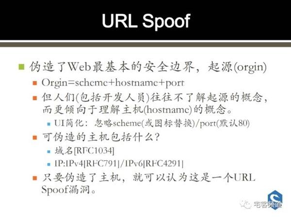 在了解完URL的各個參數(shù)后,徐少培給出了URL Spoof漏洞的詳細(xì)的定義和說明。地址欄欺騙漏洞,偽造了Web最基本的安適界限,起源(orgin)。