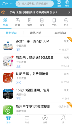 作為電信的主營(yíng)銷推廣業(yè)務(wù),“流量來(lái)了”APP為用戶提供大量的電信、移動(dòng)和聯(lián)通免費(fèi)流量活動(dòng),免費(fèi)流量活動(dòng)以簡(jiǎn)單易操作為主。活動(dòng)種類形式多樣,關(guān)注公眾號(hào)送流量、玩游戲送流量、理財(cái)送流量等等,用戶可以通過(guò)活動(dòng)分類來(lái)進(jìn)行選擇喜歡的活動(dòng)。