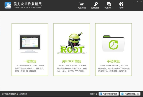 2、運(yùn)行軟件,可以看到界面有三種數(shù)據(jù)恢復(fù)模式,這里就選擇“一鍵恢復(fù)”模式來恢復(fù)刪除的聊天記錄,不過需要先獲取到手機(jī)的root權(quán)限,點(diǎn)擊之后軟件會(huì)自動(dòng)獲取手機(jī)的root權(quán)限。