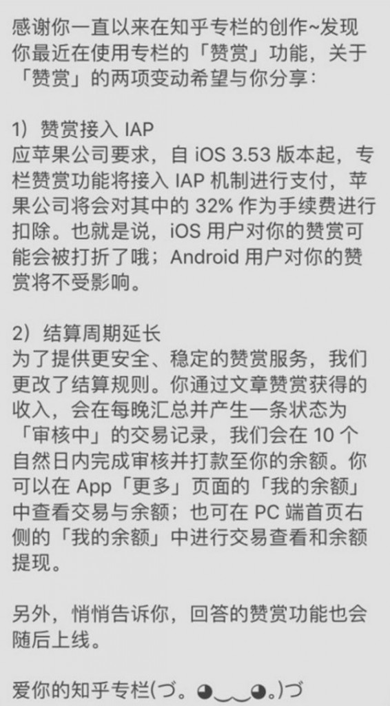 巨人網(wǎng)絡(luò)通訊聲明:本文標(biāo)題《微信之后,知乎也遭蘋果強(qiáng)制“收取”贊賞手續(xù)費(fèi)》,本文關(guān)鍵詞 微信,之后,知乎,也,遭,蘋果,;如發(fā)現(xiàn)本文內(nèi)容存在版權(quán)問題,煩請(qǐng)?zhí)峁┫嚓P(guān)信息告之我們,我們將及時(shí)溝通與處理。本站內(nèi)容系統(tǒng)采集于網(wǎng)絡(luò),涉及言論、版權(quán)與本站無關(guān)。