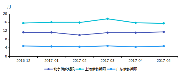 2017 年 5 月,全國網(wǎng)貸行業(yè)平均借款期限為8. 66 個月,北京市網(wǎng)貸行業(yè)平均借款期限為11. 43 個月,較上月平均借款期限拉長3.35%,高于全國網(wǎng)貸行業(yè)平均借款期限2. 77 個月;上海市網(wǎng)貸行業(yè)平均借款期限為15. 47 個月,較 4 月平均借款期限縮短1.46%,高于全國網(wǎng)貸行業(yè)平均借款期限6. 81 個月;廣東省網(wǎng)貸行業(yè)平均借款期限為4. 76 個月,較上期平均借款期限拉長8.92%,低于全國網(wǎng)貸行業(yè)平均借款期限3. 9 個月。