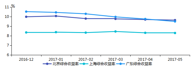 2017 年 5 月,全國網(wǎng)貸行業(yè)綜合收益率為9.21%,北京市網(wǎng)貸行業(yè)綜合收益率為9.64%,較上月下降 6 個基點,高于全國網(wǎng)貸綜合收益率 43 個基點;上海市網(wǎng)貸行業(yè)綜合收益率為8.29%,較上月下降 2 個基點,低于全國網(wǎng)貸綜合收益率 92 個基點;廣東省網(wǎng)貸行業(yè)綜合收益率為9.5%,較上月下降 26 個基點,高于全國網(wǎng)貸綜合收益率 29 個基點( 1 個基點=0.01%)。