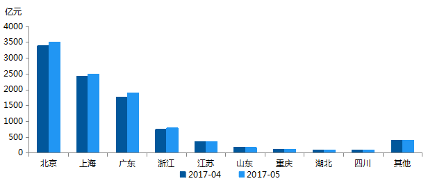 截至 2017 年 5 月底,北京、上海、廣東網(wǎng)貸平臺貸款余額總計7910. 81 億元,其中,北京網(wǎng)貸平臺貸款余額為3508. 97 億元,繼續(xù)位居全國第一,較上月上升3.6%;上海網(wǎng)貸平臺貸款余額為2504. 53 億元,居全國第二位,較上月上升3.34%;廣東省網(wǎng)貸平臺貸款余額為1897. 31 億元,居全國第三位,較 4 月上升6.6%;同期全國網(wǎng)貸平臺貸款余額為9966. 46 億元,,環(huán)比上升4.08%。