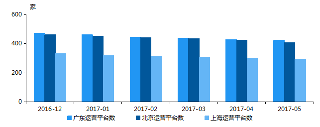 截至 2017 年 5 月底,北京、上海、廣東網(wǎng)貸平臺數(shù)量總計 1128 家,其中,北京市正常運營的網(wǎng)貸平臺共有 409 家,較上月減少 15 家;上海市正常運營的網(wǎng)貸平臺共有 295 家,較上月減少 6 家平臺;廣東省正常運營的網(wǎng)貸平臺共有 424 家,較上月減少 5 家平臺;同期全國正常運營的網(wǎng)貸平臺有 2148 家,較 4 月減少 66 家,環(huán)比減少2.98%。