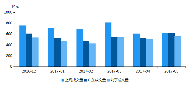 2017 年 5 月,北京、上海、廣東網(wǎng)貸成交量共計1799. 99 億元,較上月增加157. 73 億元。其中,北京本月網(wǎng)貸成交量為558. 99 億元,環(huán)比增長9.34%;上海本月網(wǎng)貸成交量為622. 84 億元,環(huán)比上升2.58%;廣東省本月網(wǎng)貸成交量為618. 16 億元,環(huán)比小幅上升18%;同期全國網(wǎng)貸成交量為2488. 44 億元,環(huán)比增長10.64%。
