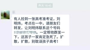 近日,一則“劉明煒同學(xué)準(zhǔn)考證丟失”消息在伴侶圈和微博上瘋轉(zhuǎn)。信息中稱,“伴侶撿到劉明煒的高考準(zhǔn)考證”,直接寫(xiě)出“劉明煒”的考點(diǎn)、考場(chǎng)、準(zhǔn)考證號(hào),并附有聯(lián)系方式,希望好心人資助擴(kuò)散。因?yàn)闇?zhǔn)考證直接影響考生參加考試,很多網(wǎng)友看到這條消息時(shí),會(huì)自發(fā)擴(kuò)散以幫手“劉明煒”找回準(zhǔn)考證。
