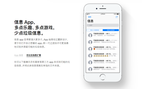 其中,iMessage可以在iOS和Mac等多設備同步,支持Apple Pay,同時發(fā)布會提到短信還將搭配其他特殊功能。而會后蘋果官網(wǎng)更新顯示該功能為騰訊手機管家提供的“防騷擾及詐騙短信”(即防垃圾信息)。按照蘋果官方網(wǎng)站對于此功能的介紹,“你可以下載騰訊手機管家等第三方 app 來偵測可能的垃圾信息,并將此類信息隔離在單獨的文件夾里?!边@意味著iOS11 正式發(fā)布之后,用戶將獲得由騰訊安適提供的全場景防騷擾掩護。
