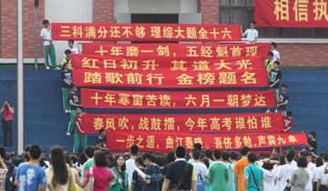 高三黨們躊躇滿志的應(yīng)考標(biāo)語(yǔ)在網(wǎng)絡(luò)上已經(jīng)成為不少段子手發(fā)揮的對(duì)象,“要想成功,必先發(fā)瘋!今日瘋狂,明日輝煌”等標(biāo)語(yǔ)正能量爆棚,“不學(xué)?將來(lái)別人壁咚的墻就是你砌的”雖然奇葩卻很勵(lì)志;也有的口號(hào)大膽暢想未來(lái),勾勒出一幅前程似錦的宏偉藍(lán)圖“進(jìn)清華,與主席總理稱兄道弟;入北大,同大家巨匠論道談經(jīng)”。