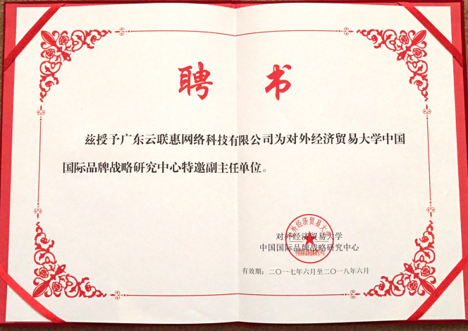 對外經(jīng)濟(jì)貿(mào)易大學(xué)中國品牌戰(zhàn)略研究中心授予云聯(lián)惠聘書