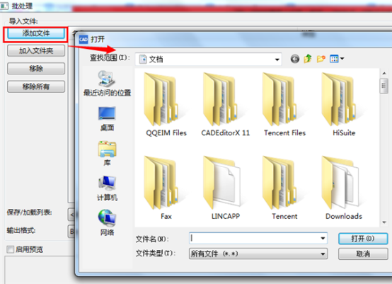2、然后請(qǐng)?jiān)趶棾龅拇翱诮缑嬷校?,點(diǎn)擊“添加文件”按鈕,選擇導(dǎo)入需要轉(zhuǎn)換文件格式的cad工程圖紙,并按下“打開”按鈕。