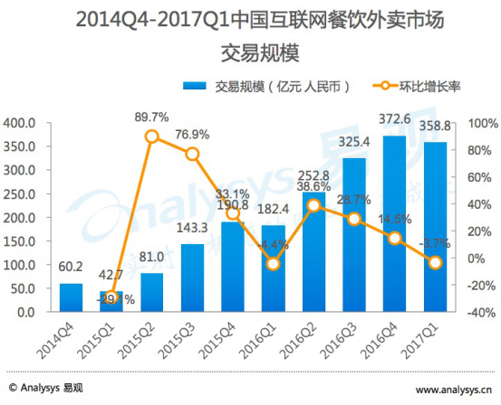 對中國互聯(lián)網(wǎng)餐飲外賣市場而言,每年第 1 季度都會受到季節(jié)性因素影響。但橫向比對近三年第 1 季度的表示,可以看出受影響的程度逐步遞減。就交易規(guī)模連結(jié)不變增長的態(tài)勢來看,預(yù)計下季度開始,外賣市場仍顯現(xiàn)出較強(qiáng)的增長潛力。