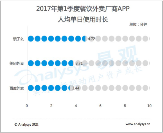 別的,餓了么第 1 季度APP人均單日使用時長達(dá)到4.72 分鐘,仍連結(jié)領(lǐng)先地位,美團(tuán)外賣以人均單日使用時長 3.71 分鐘隨其后。百度外賣人均單日使用時長則為 3.44 分鐘。