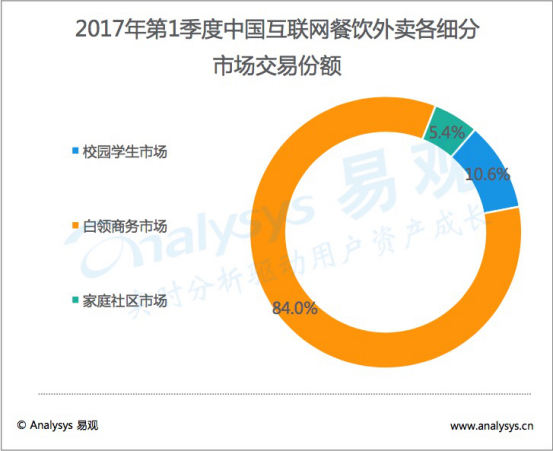 細(xì)分市場方面,白領(lǐng)商務(wù)市場的霸權(quán)地位有增無減,市場交易規(guī)模達(dá)到301. 4 億元,占整體外賣市場 84.0%的份額,且份額占比仍在擴(kuò)大。學(xué)生校園細(xì)分市場份額與上個季度占比基本持平,為 10.6%。此外,生活社區(qū)市場占比 5.4%。