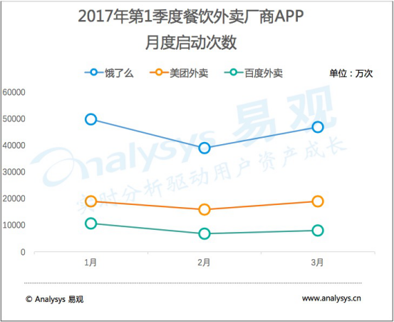 在APP月度啟動次數(shù)上,餓了么也以接近 5 億次的啟動次數(shù)在第 1 季度領(lǐng)先。