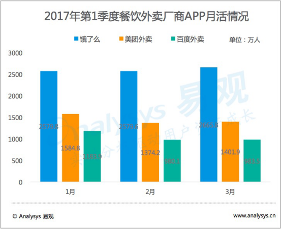 日前,易不雅觀發(fā)布 2017 年第 1 季度中國互聯(lián)網(wǎng)餐飲外賣市場分析陳訴。數(shù)據(jù)顯示, 2017 年第 1 季度中國互聯(lián)網(wǎng)餐飲外賣市場整體交易規(guī)模達(dá)358. 8 億元人民幣,與去年同期比擬,增幅達(dá)96.7%。從外賣市場用戶使用情況看,餓了么月活人數(shù)第一,達(dá)2665. 8 萬人,超過美團(tuán)外賣和百度外賣月活人數(shù)的總和。