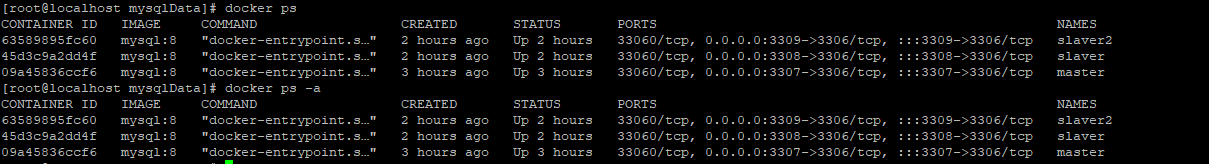 docker run -itd -p 3309:3306 --name slaver2 -v /usr/local/mysqlData/slave2/cnf:/etc/mysql/conf.d -v /usr/local/mysqlData/slave2/data:/var/lib/mysql -e MYSQL_ROOT_PASSWORD=123456 mysql:8