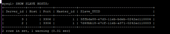 能從主服務(wù)器查詢到兩臺(tái)從服務(wù)器的ID以及端口。完成MySQL部署。