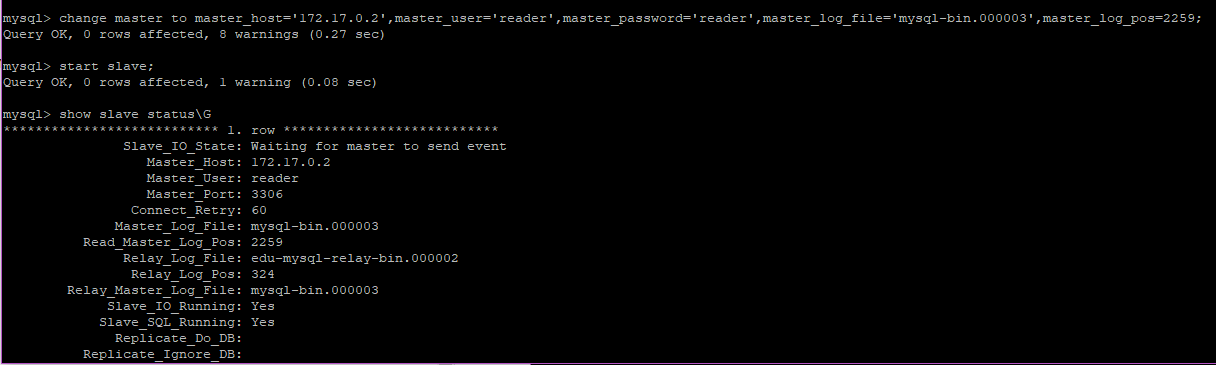 change master to master_host='172.17.0.2',master_user='reader',master_password='reader',master_log_file='mysql-bin.000003',master_log_pos=2259;