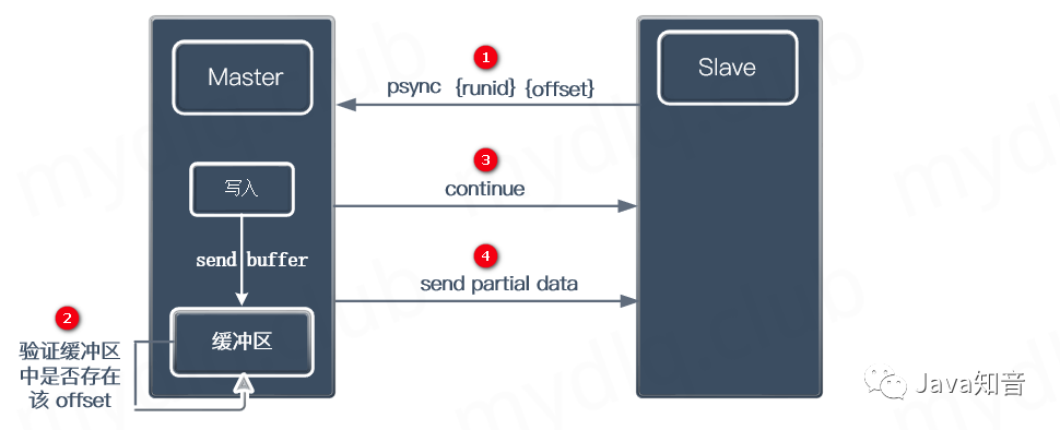 當(dāng)從節(jié)點(diǎn)與主節(jié)點(diǎn)發(fā)送中斷后,從節(jié)點(diǎn)會重新連接主節(jié)點(diǎn),這時會觸發(fā)增量復(fù)制,過程如下: