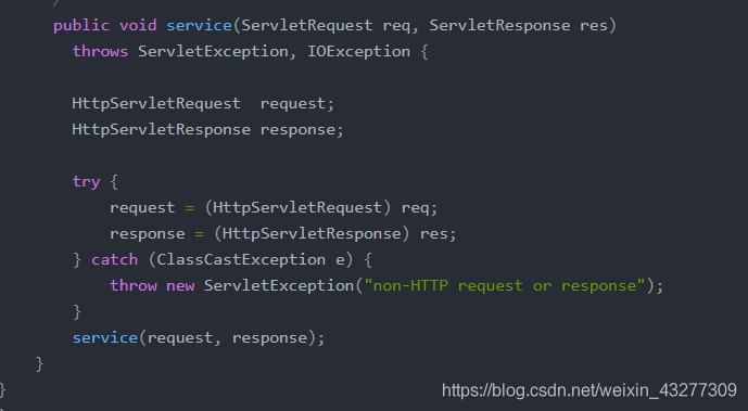 可知這個抽象類繼承了GennericeServlet這個抽象類 也就是逐層往下推,實現(xiàn)了Servle接口,那么這個抽線類必然也繼承了serice方法。